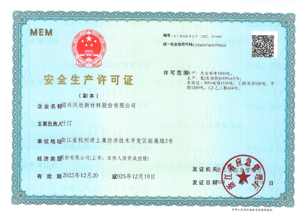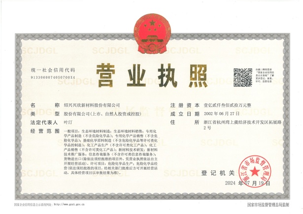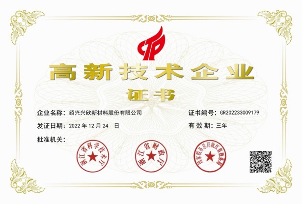 紹興興欣新材料股份有限公司成立于2002年06月27日,占地面積122畝,位于杭州灣上虞經(jīng)濟技術開發(fā)區(qū)拓展路2號,現(xiàn)有職工200余人,專業(yè)技術人員50余人;博士、碩士研究生30余人組成的一支知識型、專業(yè)化的技術科研團隊。公司面向全球市場,專業(yè)開發(fā)電子化學品、環(huán)保化學品、醫(yī)藥中間體、高分子材料等先進新材料重點領域的省級科技型企業(yè);建有浙江上虞、安徽東至兩個生產(chǎn)基地。目前為“國家高新技術企業(yè)”、浙江省“隱形冠軍”企業(yè)、浙江省專精特新中小企業(yè);建有“省級”研究開發(fā)中心,共建天津大學浙江紹興研究院電子化學品研發(fā)中心。